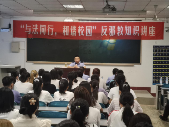 为进一步加深我校学生对邪教组织本质与危害的认识,提高学生鉴别和抵御邪教的能力,共建平安和谐校园,9月24日,我校特邀四川省公安厅反邪教讲师团讲师、宜宾市公安局反邪教支队副支队长万俊在硕勋楼201教室开展“与法同行,和谐校园”反邪教知识讲座。翠屏区公安分局政保大队、学校保卫处部分领导和干警及110余名学生聆听讲座。