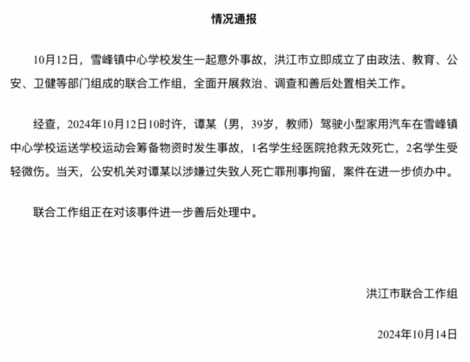 近日,有网民发文称,10月12日,湖南洪江市雪峰镇中心学校一老师在幼儿园内开车,撞倒3名孩子,致一人身亡,事件引发热议。10月14日,湖南洪江市联合工作组发布情况通报,称公安机关对涉事教师谭某以涉嫌过失致人死亡罪刑事拘留。通报全文如下↓