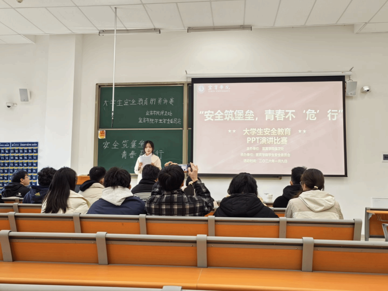2026年1月9日下午,宜宾学院学生安全委员会于临港校区二期7E104教室,成功举办“安全筑堡垒,青春不‘危’行”大学生安全教育比赛,安委会指导老师陈燕秋与80余名学生干部共同参与。