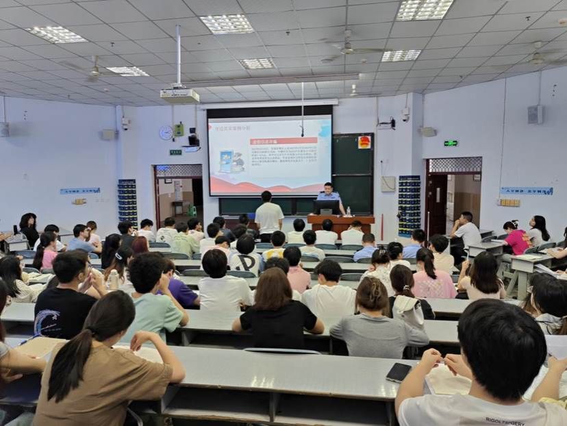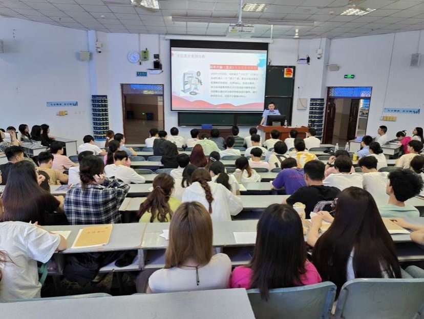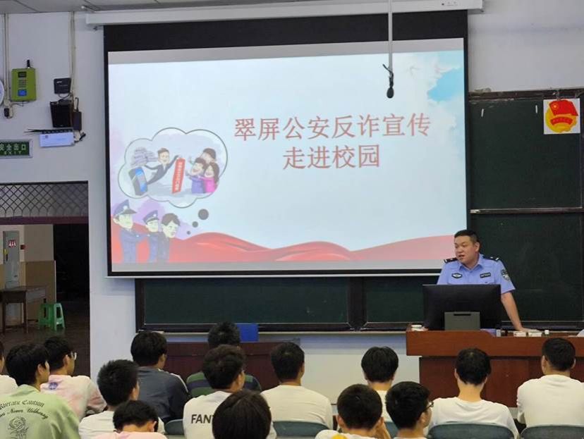 为提高同学们的防诈骗意识,增强自我保护能力,2024年6月19日,保卫处邀请翠屏区新街派出所万警官等三名民警进校园,在三教A102教室开展主题为“反诈宣传进校园”的讲座。材化学院专兼职辅导员和学生代表150余人参与了讲座。